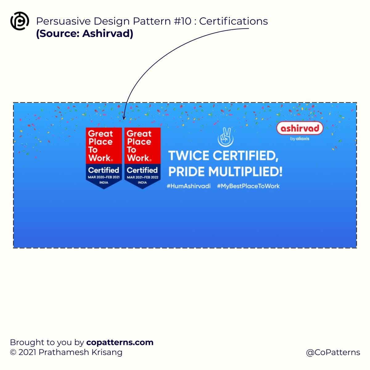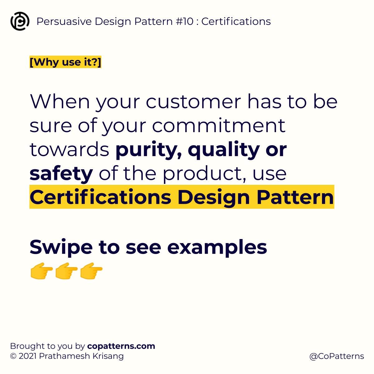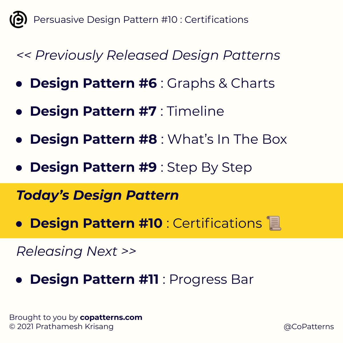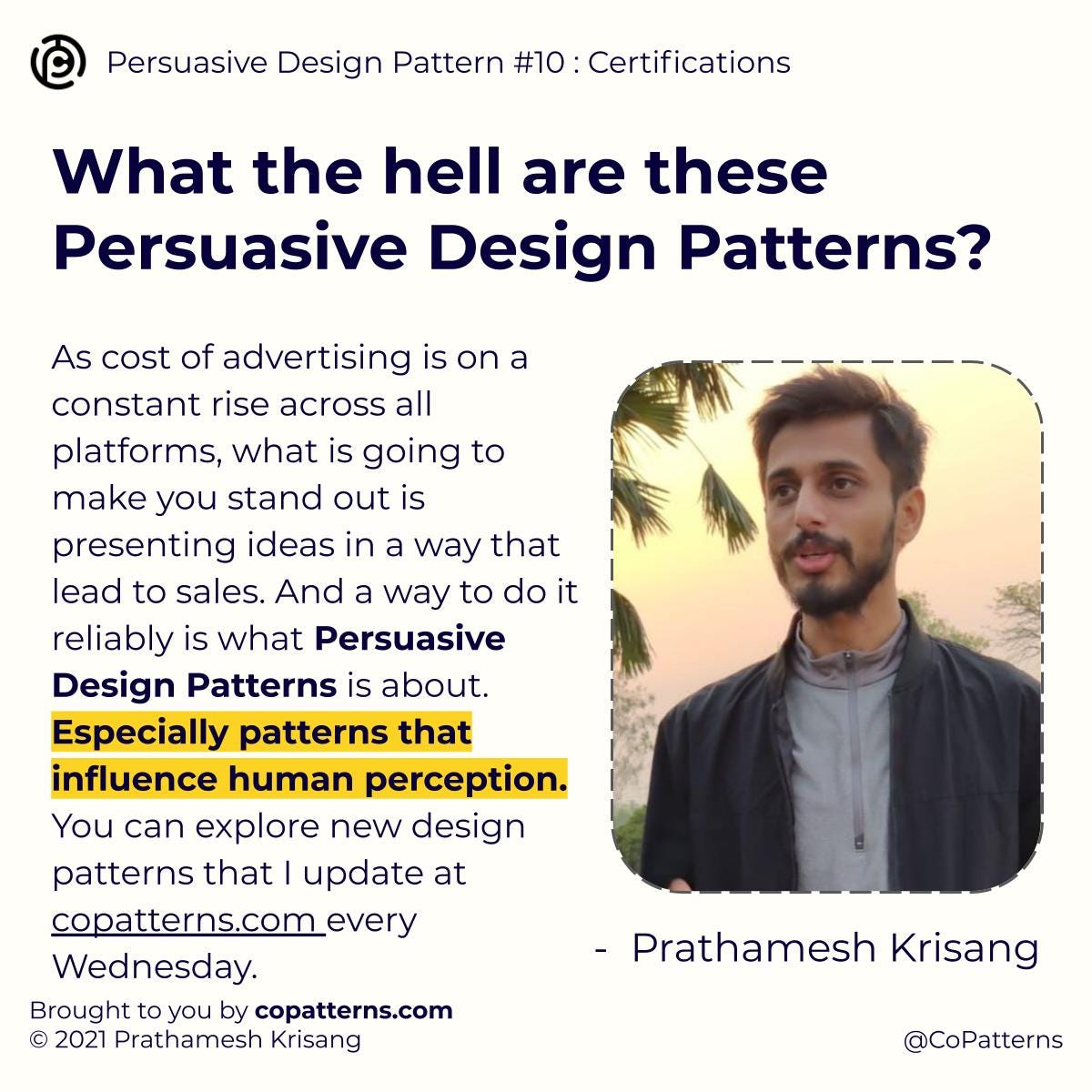 Some patterns are fundamentally important to convey a message, other patterns compliment the original message to make it more impactful. Today’s design pattern is one of those complimentary design pattern that adds an extra punch to your original messaging or offer. And that is the Persuasive Design Pattern # 10 : Certifications